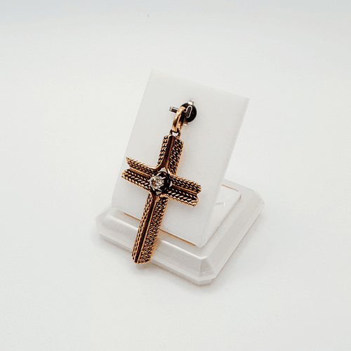 Pendentif croix travaillé / ciselé - or jaune sertie d'un Diamant central